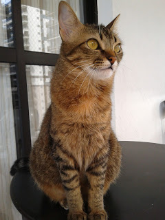 5 - Todos os dias de manhã, Chloe fica "de guarda" na porta do nosso quarto, esperando a gente se levantar. Quando abrimos a porta, ela se espreguiça toda e começa a fazer uns barulhinhos baixinhos, como se fosse um resmungo, e sai se esfregando... na porta, nas paredes, e, de vez em quando (rs), nas nossas pernas. Daí, ela vai andando pelo corredor e olhando pra trás, para ver se a estamos seguindo. O objetivo é chegar à cozinha pois, lá, ela sabe que vai ganhar o "café da manhã" de ração.