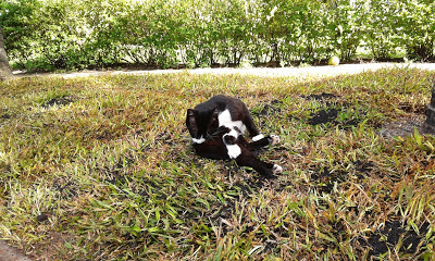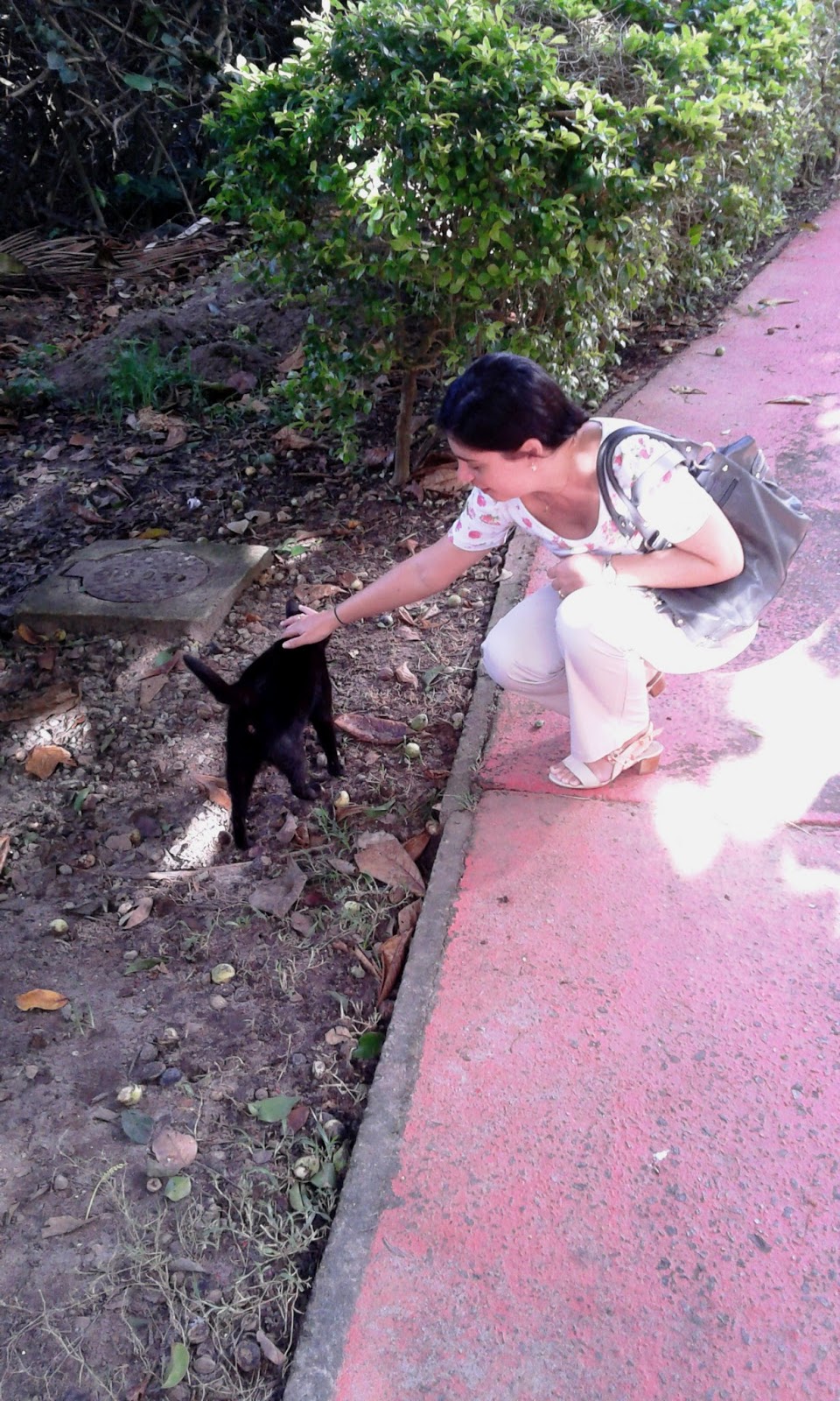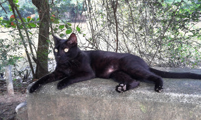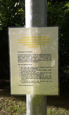 Nem preciso dizer que, para mim, é uma delícia sair para caminhar no início da noite, ou pela manhã, e ir cruzando com cada um dos gatinhos pelo caminho. Cada um tem um jeito, um é mais arisco, o outro se esparrama todo no chão para ganhar carinho, e por aí vai. O que também acho legal é que, apesar de na vizinhança predominar, maciçamente, donos de cachorro, os dois lados parecem conviver bem. Já vi pessoas com seus cachorros parando para que os gatinhos da área fossem cheirar os focinhos dos cãezinhos, num cumprimento cordial entre raças. Mas, às vezes, nem tudo é "céu de brigadeiro" e, infelizmente, ainda há intolerância e preconceito com nossos amigos felinos. Este gatinhos já sofreram perseguições e alguns desapareceram. Sem contar que, só no mês de janeiro, 5 gatinhos foram abandonados na área... Lamentável que ainda existam pessoas deste tipo por aí...