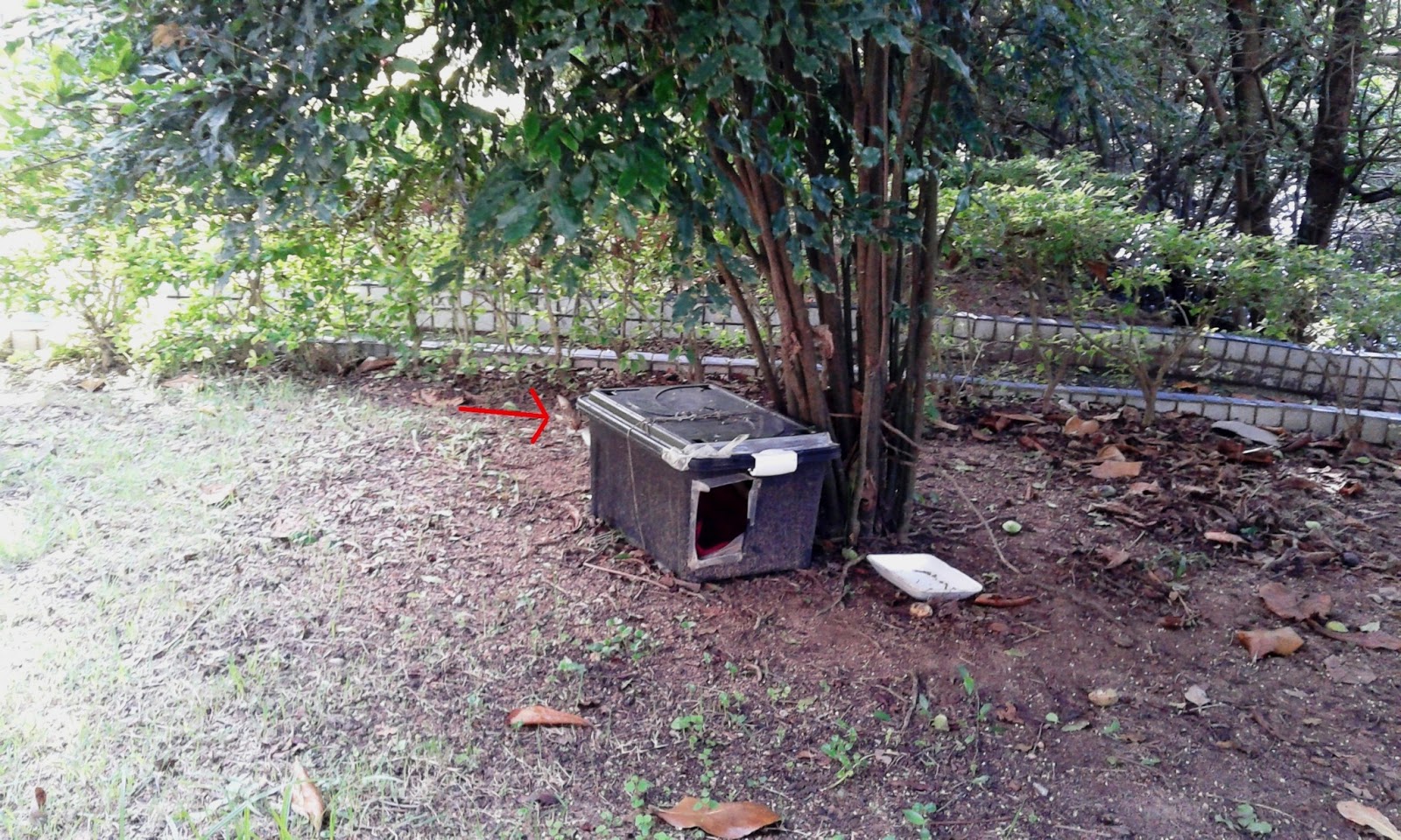 Os gatinhos contam com abrigo feito pelos voluntários para se protegerem do sol e chuva...