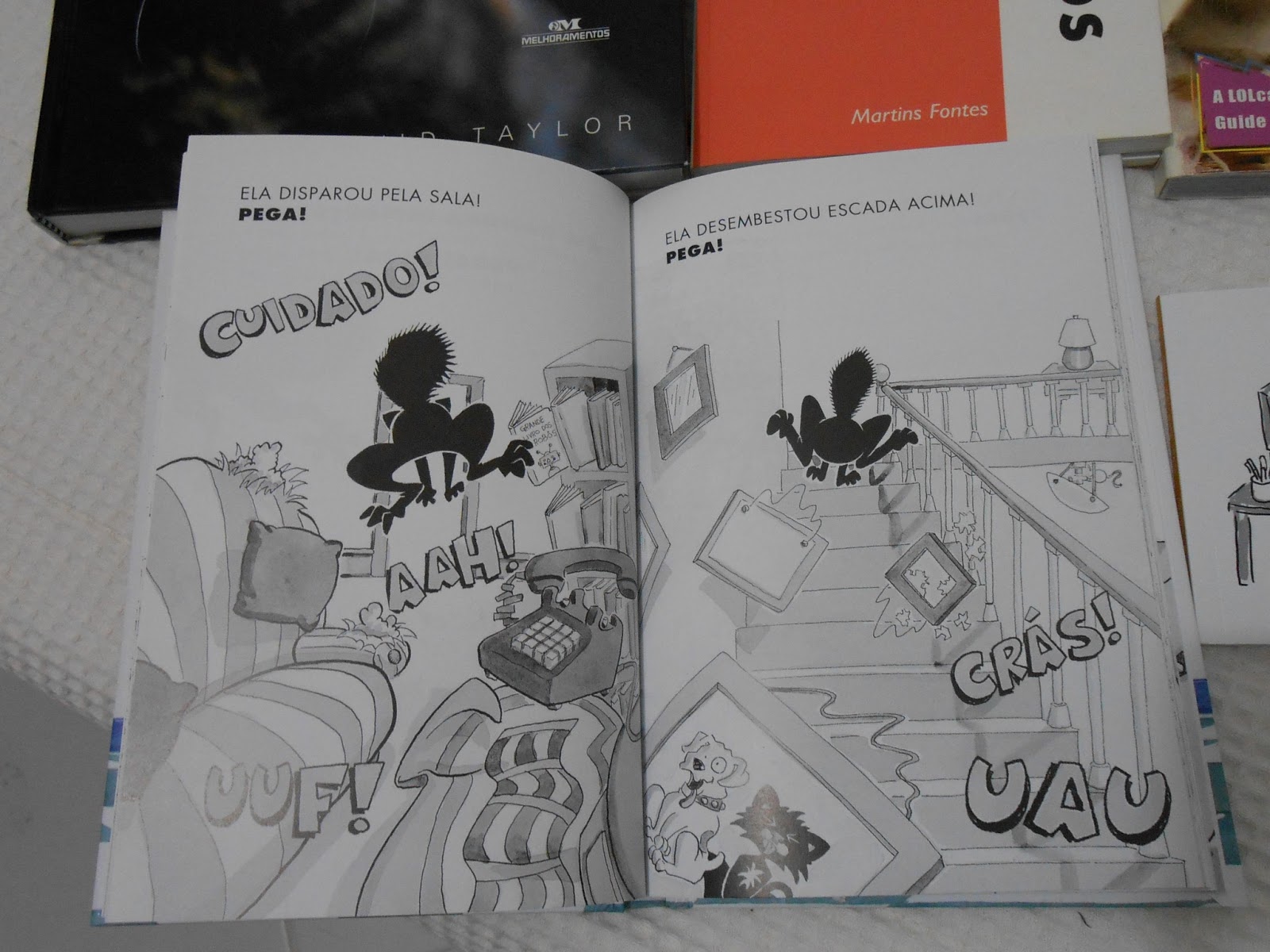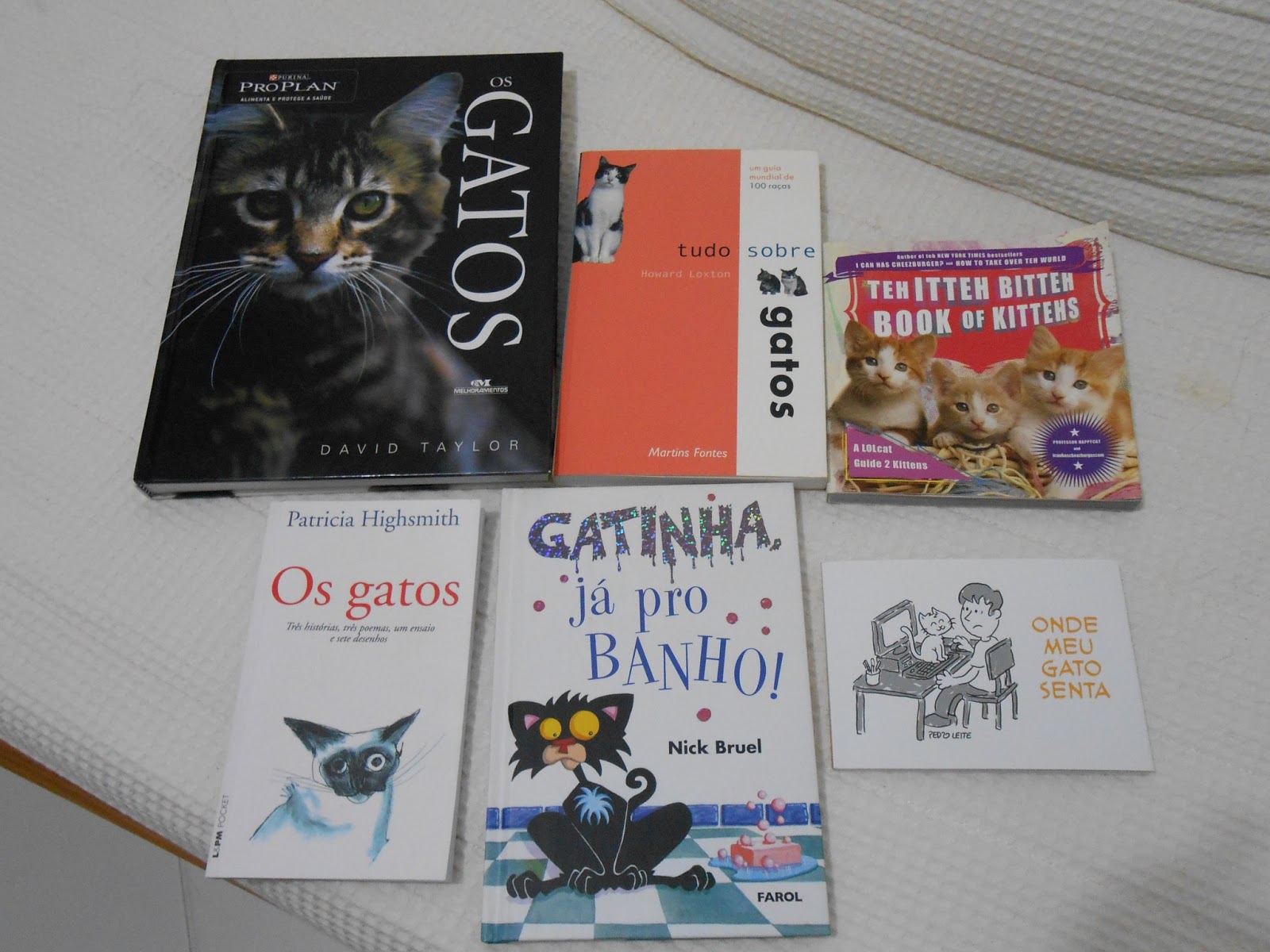 De amigos e parentes, eu ganhei alguns livros que guardo com carinho. O livro maior chamado Gatos é um guia de raças (pedigree e SRD) que gosto muito. Tem também o livro do projeto Onde Meu Gato Senta, que comprei pela internet.