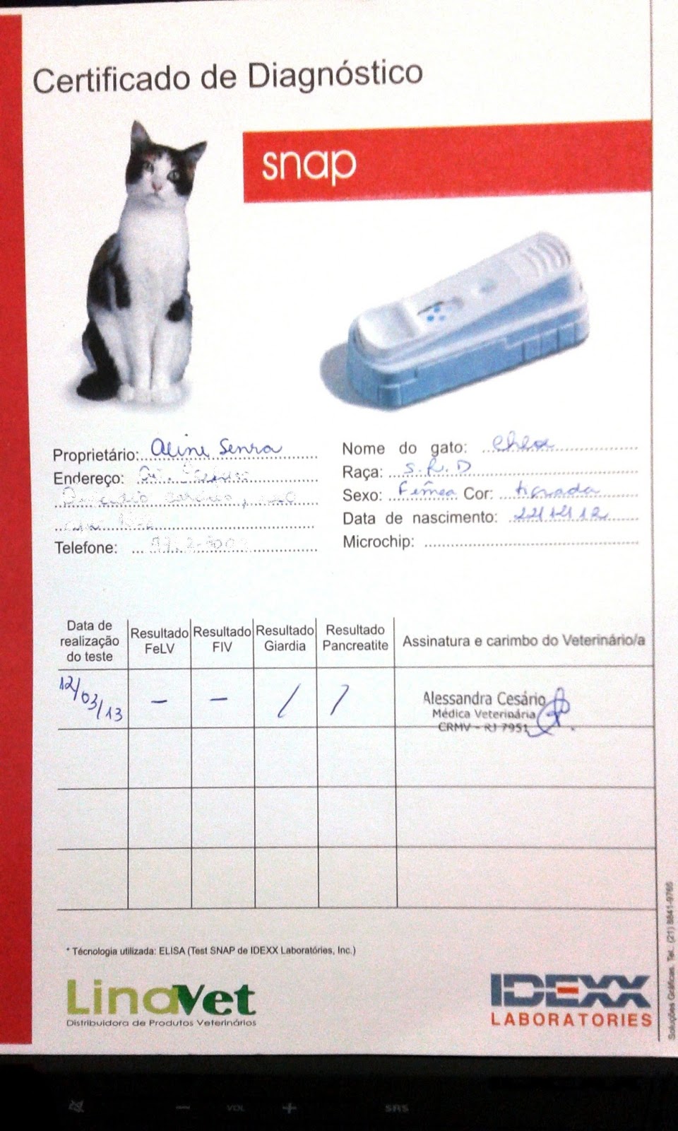 Mas... nem tudo foi ruim. Aproveitei para testá-la para FIV e FELV e... o resultado deu negativo!!!