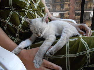 Até que recebi a notícia de que haviam abandonado, 6 filhotes (2 de três meses e 4 de dois meses) e uma mãezinha de uns 10 meses perto da minha casa, em um local onde outros gatos são tratados por voluntários da minha vizinhança (para relembrar a estória, clique aqui). Sábado, levantei de manhã e fui até lá. Encontrei com a "meninada", brincando e correndo entre as árvores e os arbustos. A mamãe gata veio ao meu encontro: muito dócil, pedindo carinho, e muito magrinha. Meu coração ficou partido. Fiquei ali por uns 30 minutos. Levei barbantes e bolinha de papel alumínio e resolvi dar um pouco de atenção a eles. Todos foram anunciados para adoção ou lar temporário urgente (pois estão ao relento e expostos na rua) mas, até o momento, não haviam conseguido ninguém para abrigá-los. Chamei meu marido para mostrar os gatinhos. Ficamos, nós dois, ali, observando e pensando... pensando... corações apertados... e resolvemos que iríamos dar uma chance a pelo menos um deles. Assim, decidimos adotar mais um gatinho!