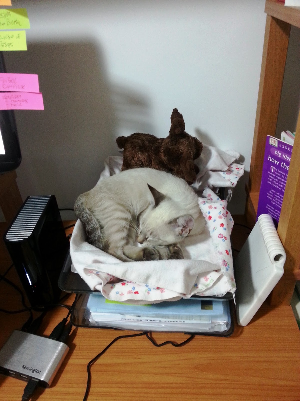 | Vou dormir aqui nesses papéis... (colocamos um bichinho de pelúcia para fazer companhia para ele) |